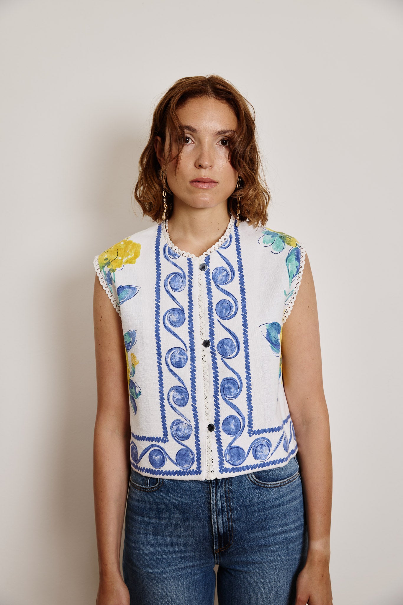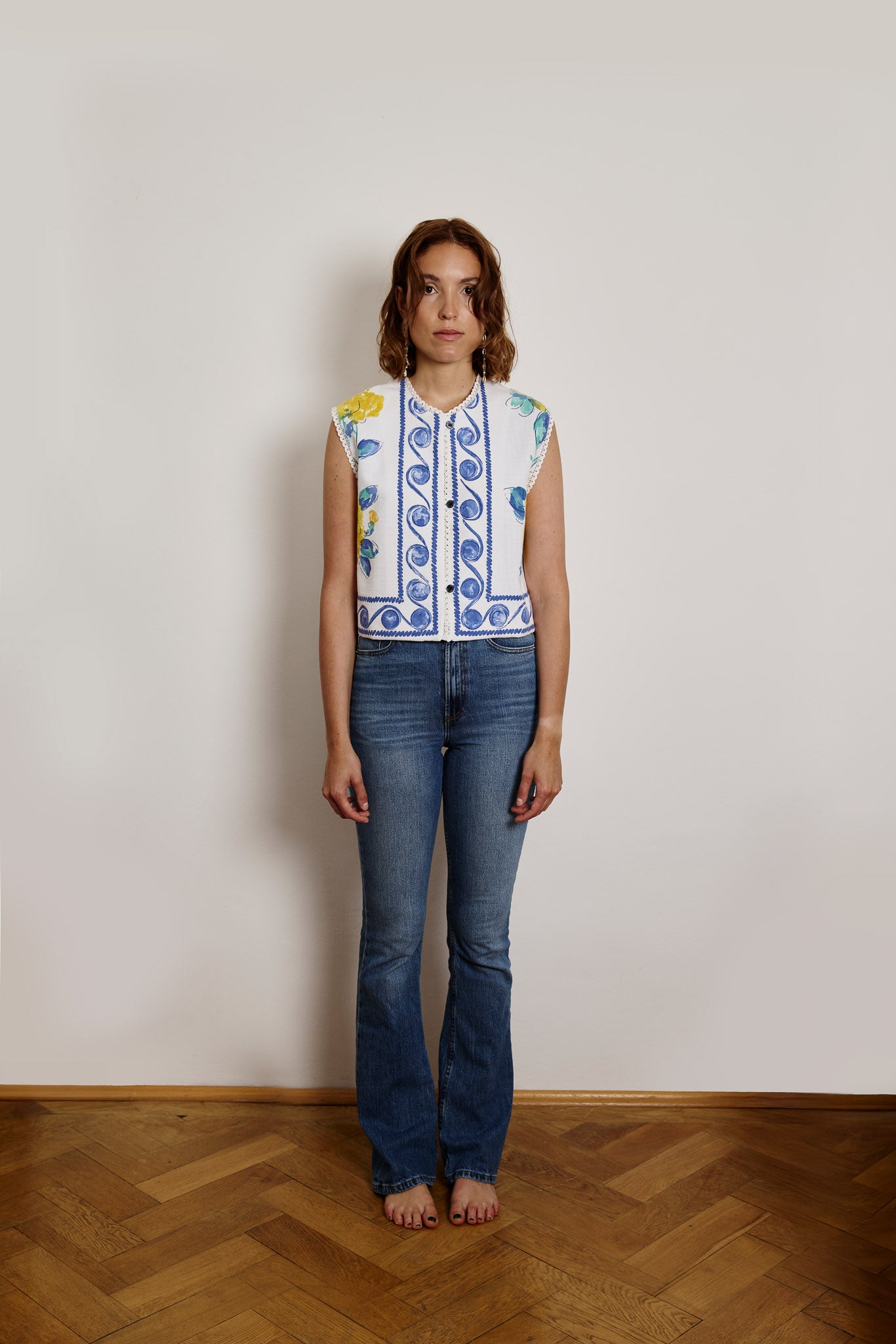 Gefertigt aus einer alten Tischdecke erzählt die Bella Vita Weste von mediterraner Leichtigkeit und handwerklicher Sorgfalt. Feine Spitze umrunden die Kanten und ein weiches Baumwollfutter unterstreichen die liebevolle Verarbeitung. Auf der Vorderseite wurde als detailverliebter Akzent der Schriftzug Bella Vita aufgestickt. Geschlossen wird die Weste vorn mit drei kleinen Knöpfen und passenden Stoffschlaufen.