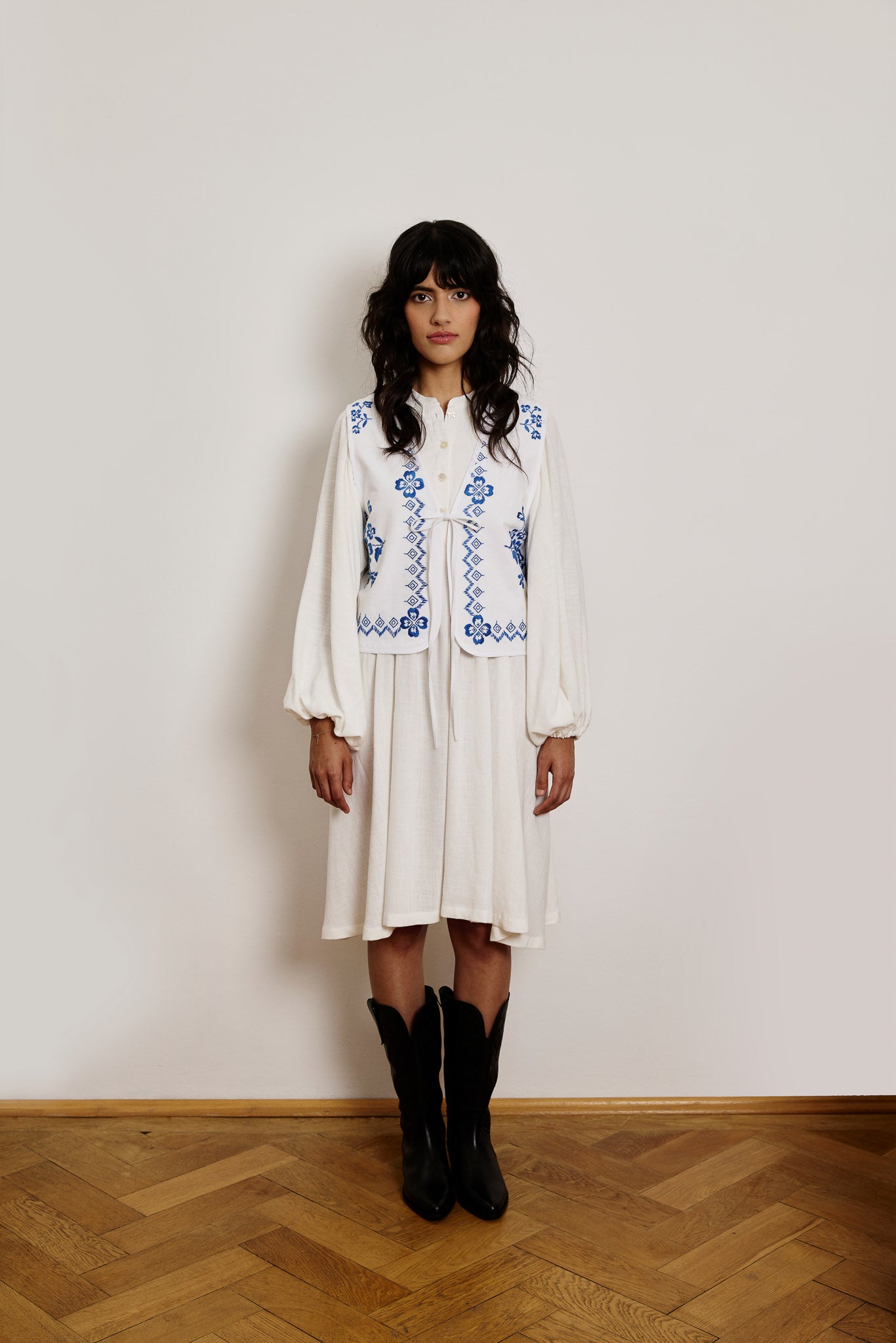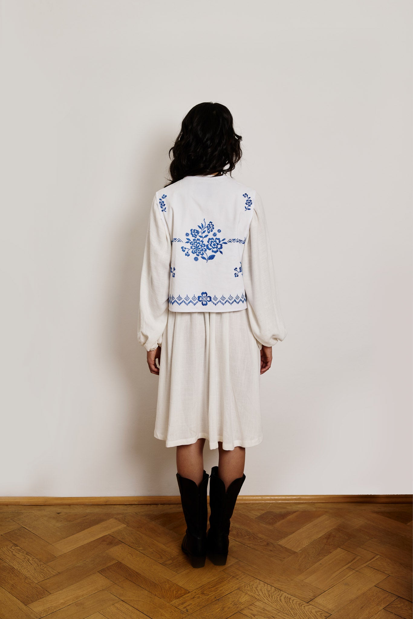 Mit Liebe zum Detail gefertigt: Die Bloom Weste wurde aus einer alten Tischdecke neu zum Leben erweckt. Die blauen Blumenstickerei verleiht ihr eine sommerliche Ausstrahlung. Gefüttert mit weicher Baumwolle sorgt sie für angenehmen Tragekomfort. Vorn wird sie mit einem schmalen Stoffband gebunden.