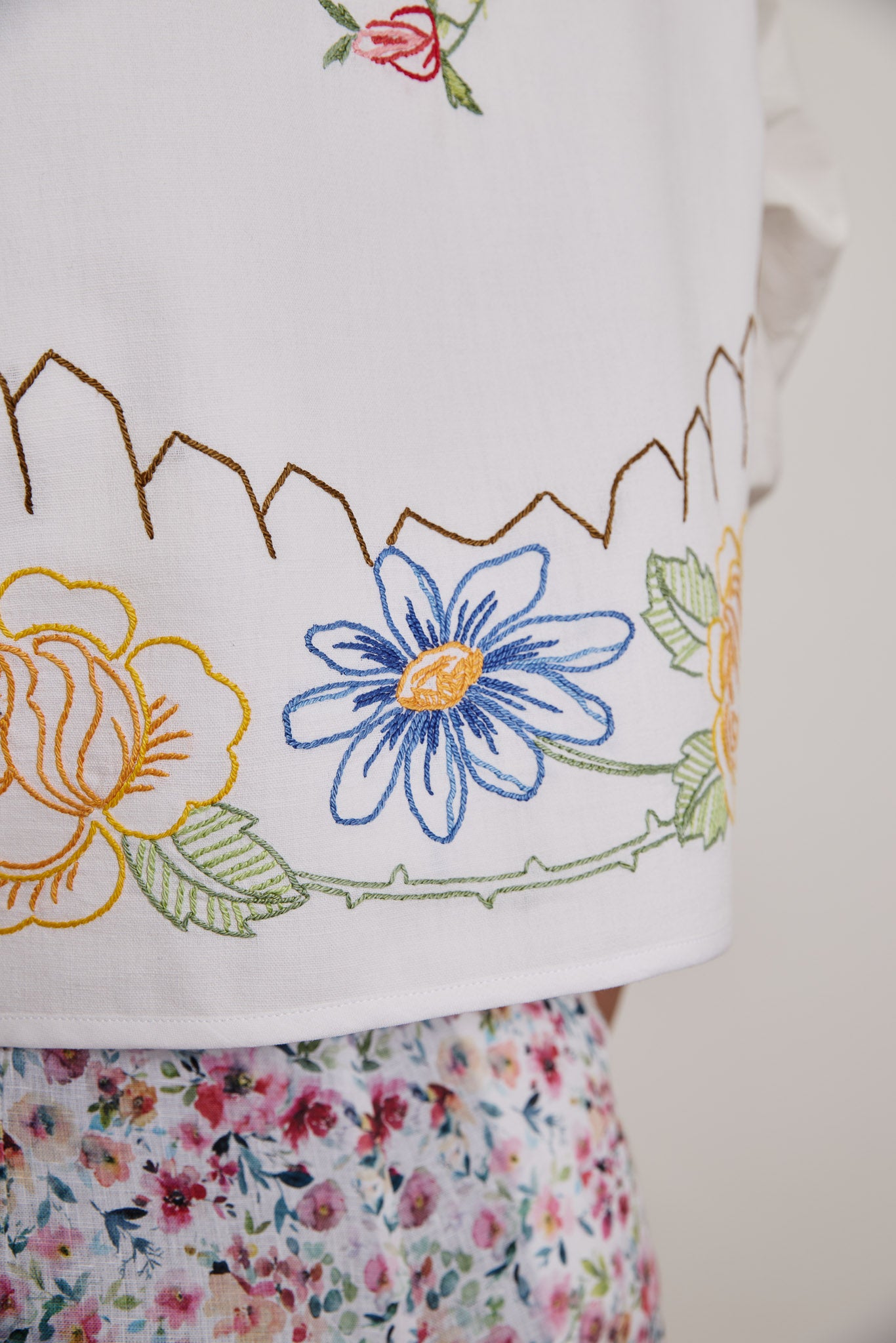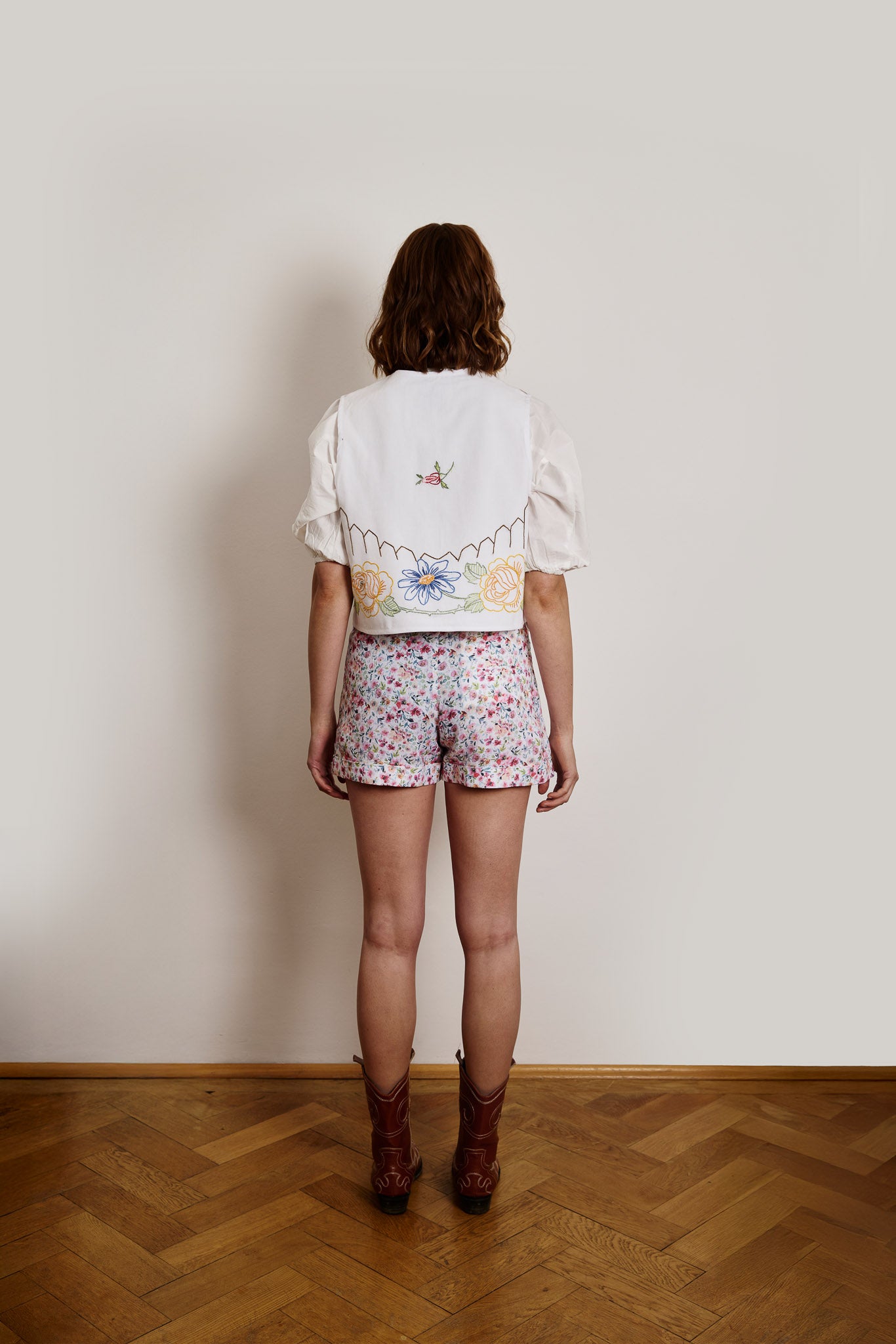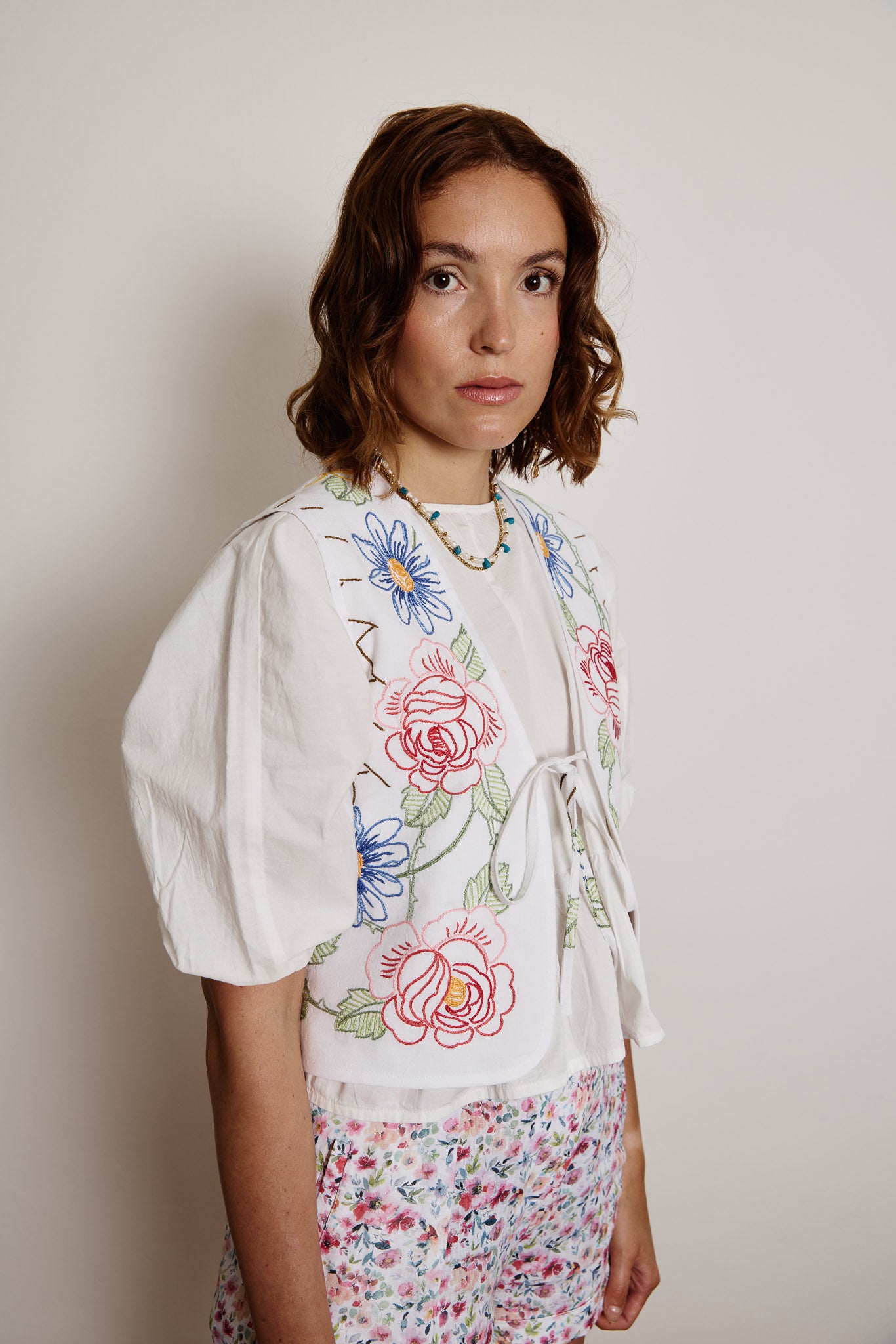 Mit Liebe zum Detail gefertigt: Die Frida Weste wurde aus einer alten Tischdecke in sorgfältiger Handarbeit neu zum Leben erweckt. Florale Stickereien zieren die Vorderseite der Weste. Gefüttert mit weicher Baumwolle sorgt sie für angenehmen Tragekomfort. Vorn wird sie mit einem schmalen Stoffband gebunden.