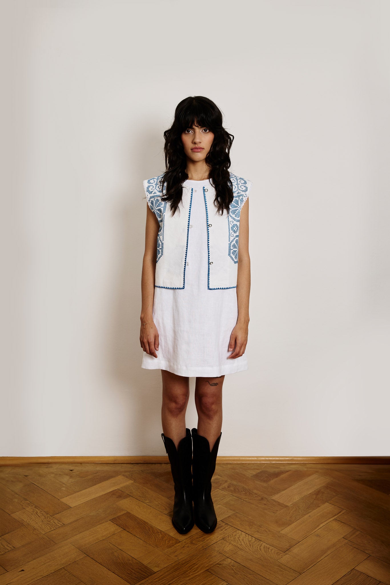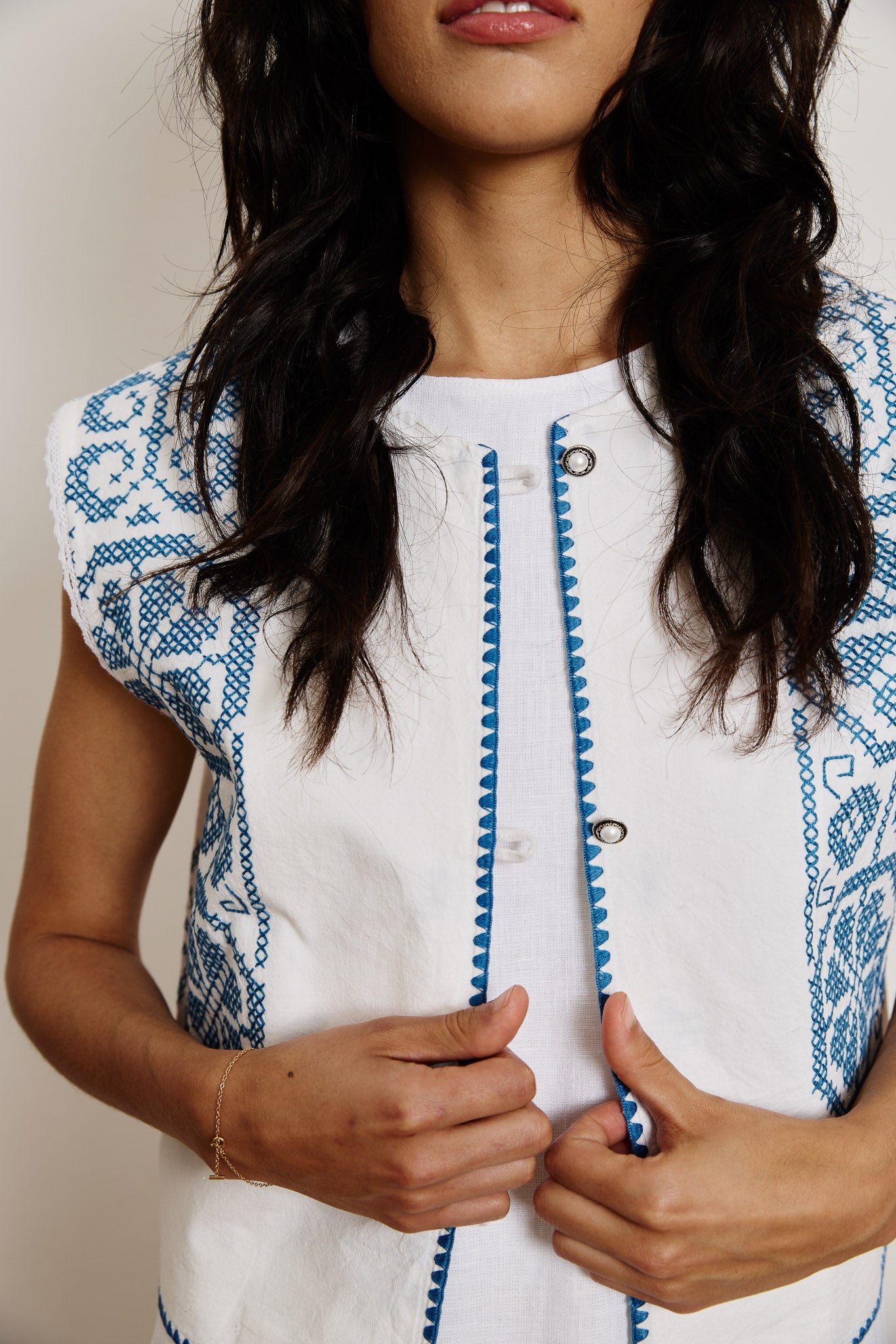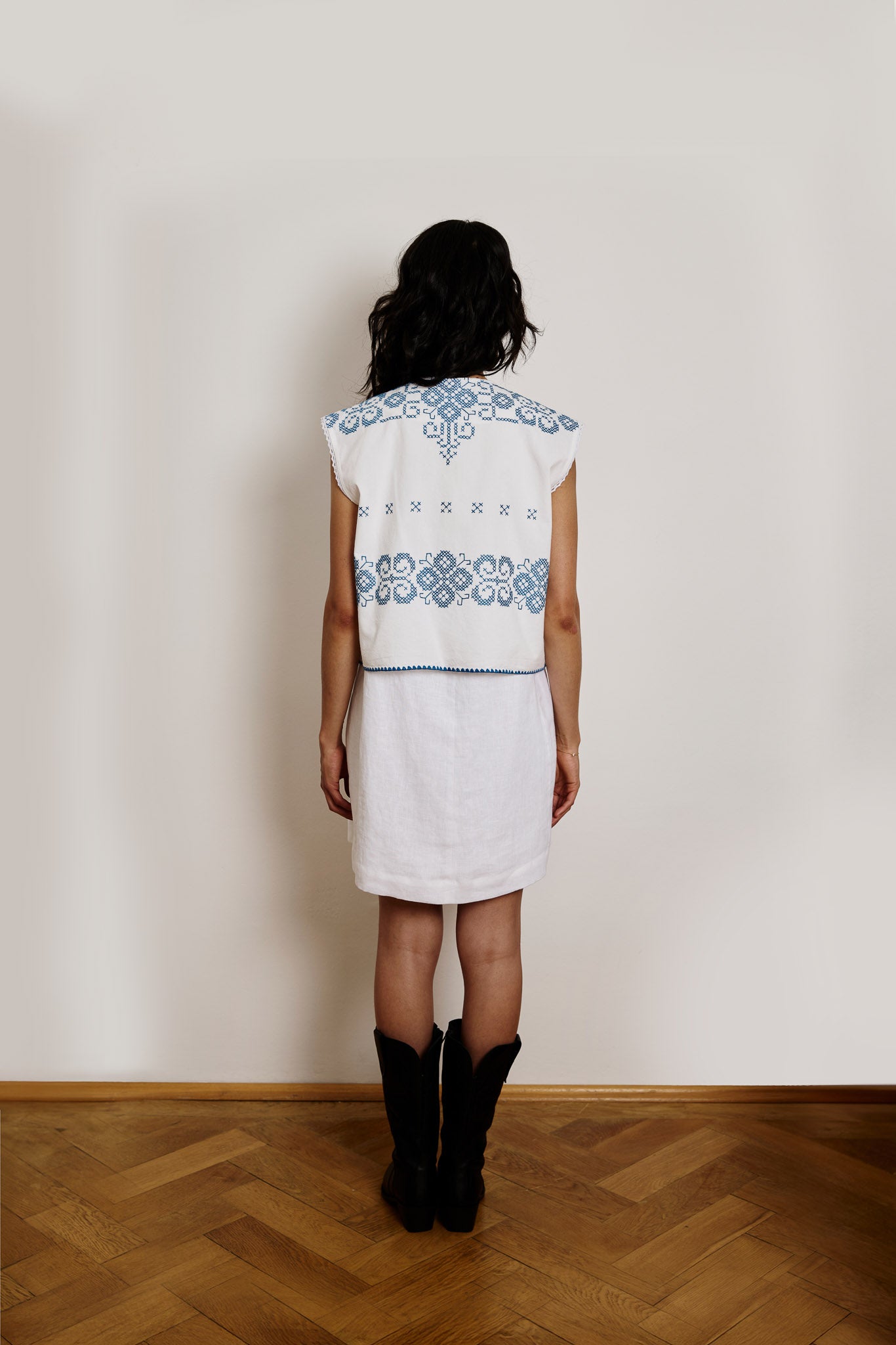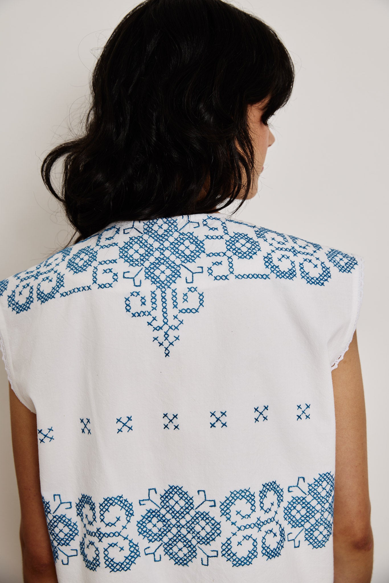 Mit Liebe zum Detail gefertigt: Die Kreuzstich Weste wurde aus einer alten Tischdecke in sorgfältiger Handarbeit neu interpretiert. Die gleichmäßig angeordneten Kreuzstichmotive erinnern an traditionelle Muster und geben der Weste einen klaren grafischen Charakter. Das ungefütterte Modell ist angenehm leicht zu tragen und entlang der Kanten mit einem feinen Zierstich in Blau abgeschlossen. Vorn lässt sich die Weste mit drei kleinen Knöpfen und Stoffschlaufen schließen.