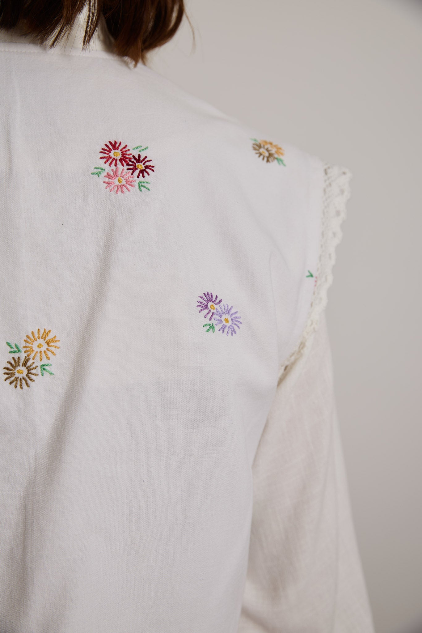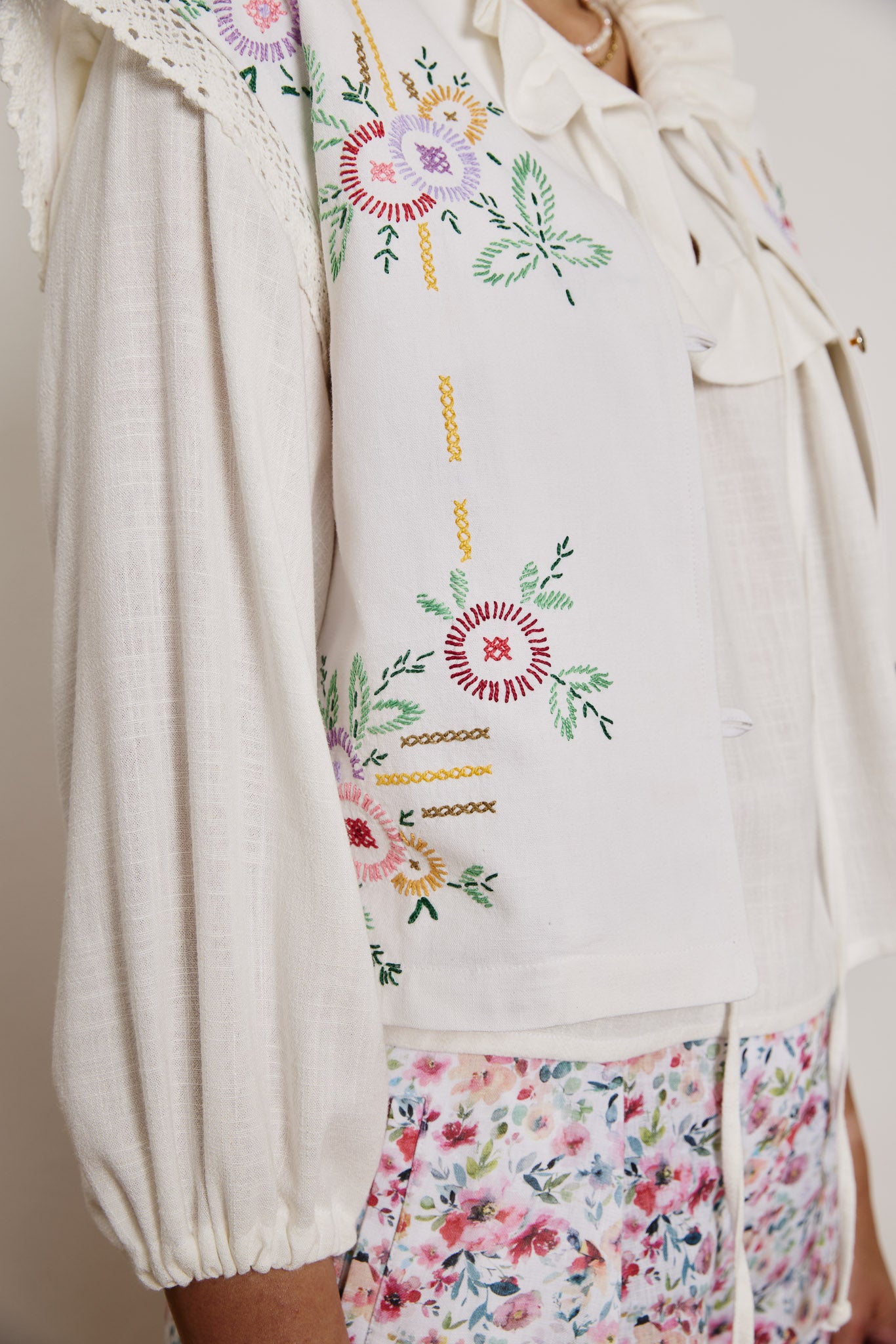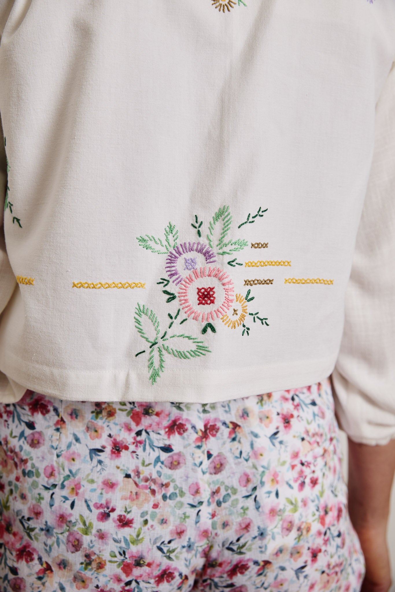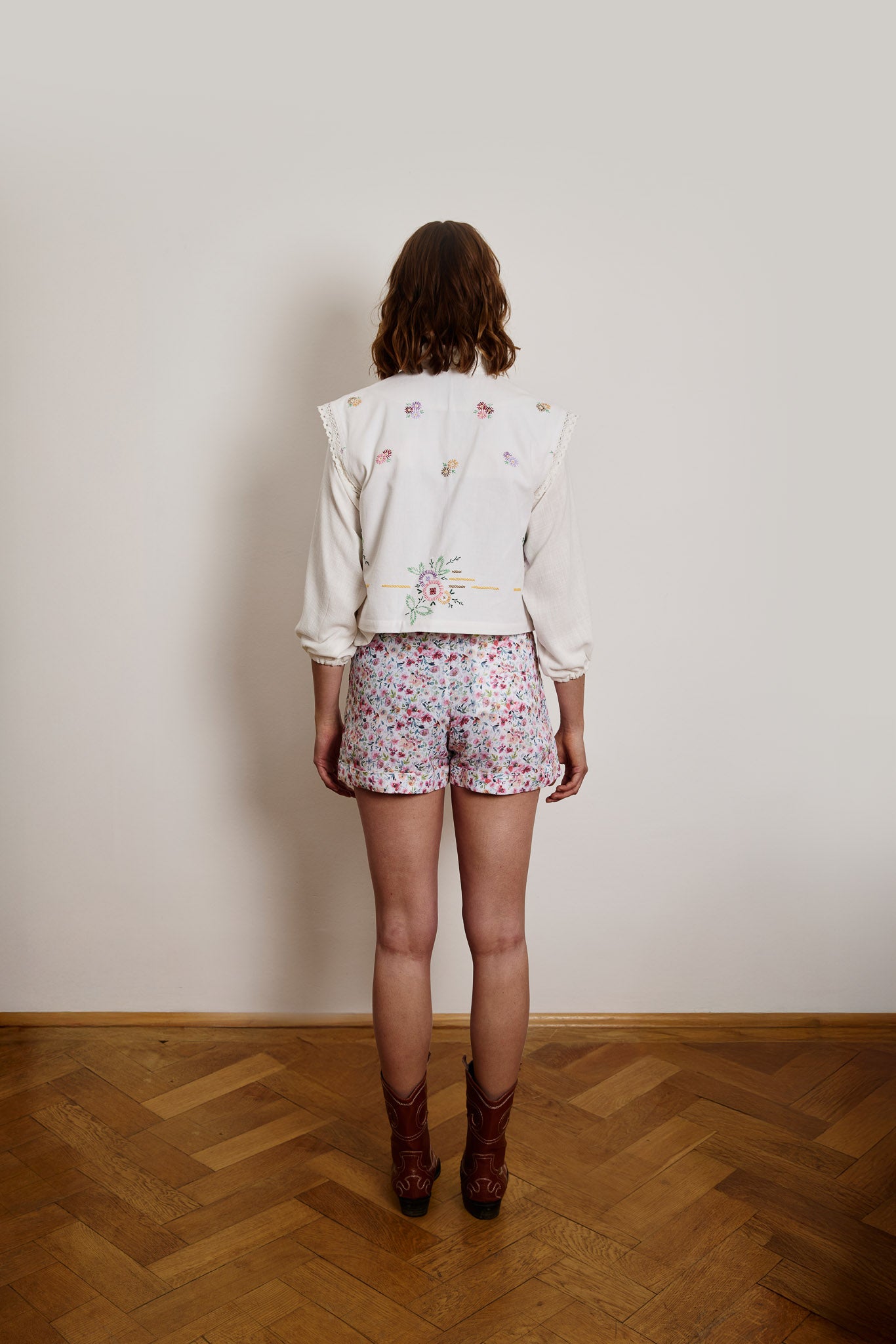 Mit Liebe zum Detail gefertigt: Die Lavendel Weste wurde aus einer alten Tischdecke neu zum Leben erweckt. Die lavendelfarbene Blumenstickerei verleiht ihr eine sommerliche Ausstrahlung. Das leichte, ungefütterte Modell ist an den Ärmelausschnitten mit feiner Spitze gearbeitet. Vorn lässt sich die Weste mit drei kleinen Knöpfen und passenden Stoffschlaufen schließen.