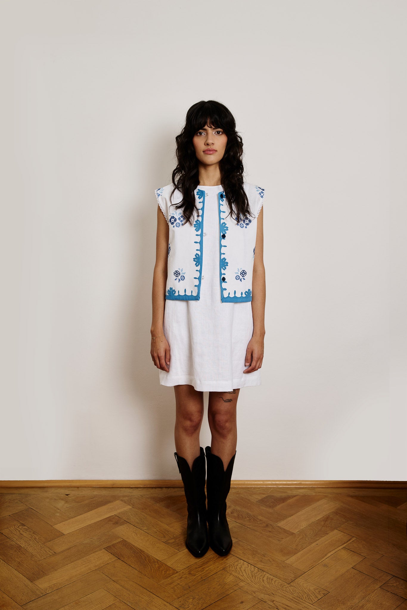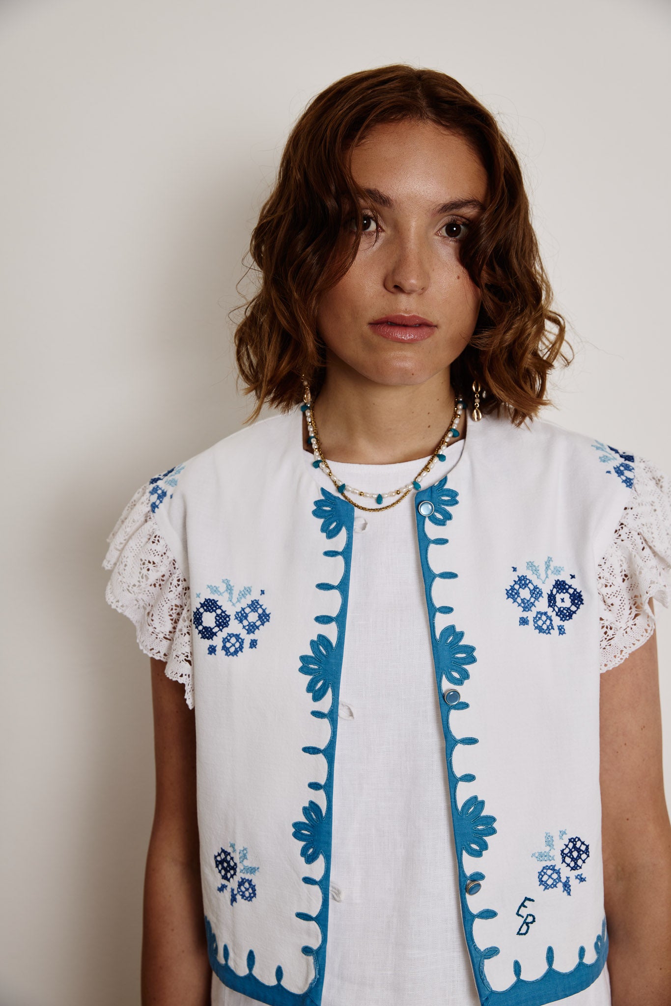 Mit Liebe zum Detail gefertigt: Die Margareta Weste wurde aus einer alten Tischdecke neu zum Leben erweckt. Die blaue Blumenstickerei verleiht ihr einen nostalgischen Charakter. Das leichte, ungefütterte Modell ist an den Ärmelausschnitten mit feiner Spitze gearbeitet. Vorn lässt sich die Weste mit drei kleinen Knöpfen und passenden Stoffschlaufen schließen.