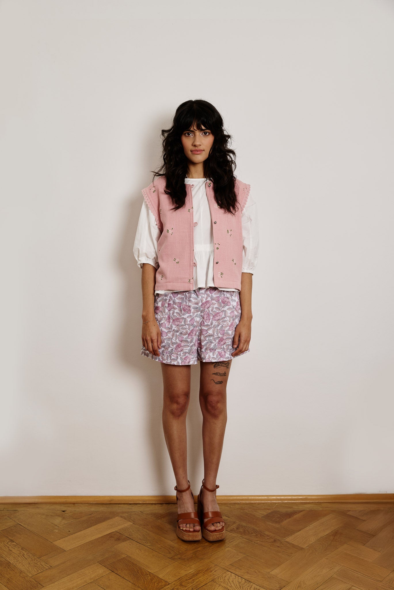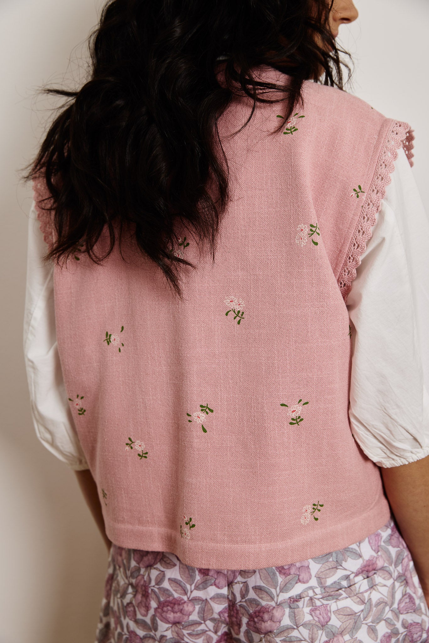 Mit Liebe zum Detail gefertigt: Die Rosalie Weste wurde aus einer alten Tischdecke neu zum Leben erweckt. Zarte florale Stickereien auf roséfarbenem Grund verleihen ihr eine sanfte, nostalgische Ausstrahlung. Das leichte, ungefütterte Modell ist an den Ärmelausschnitten mit feiner Spitze gearbeitet. Vorn lässt sich die Weste mit drei kleinen Knöpfen und passenden Stoffschlaufen schließen.