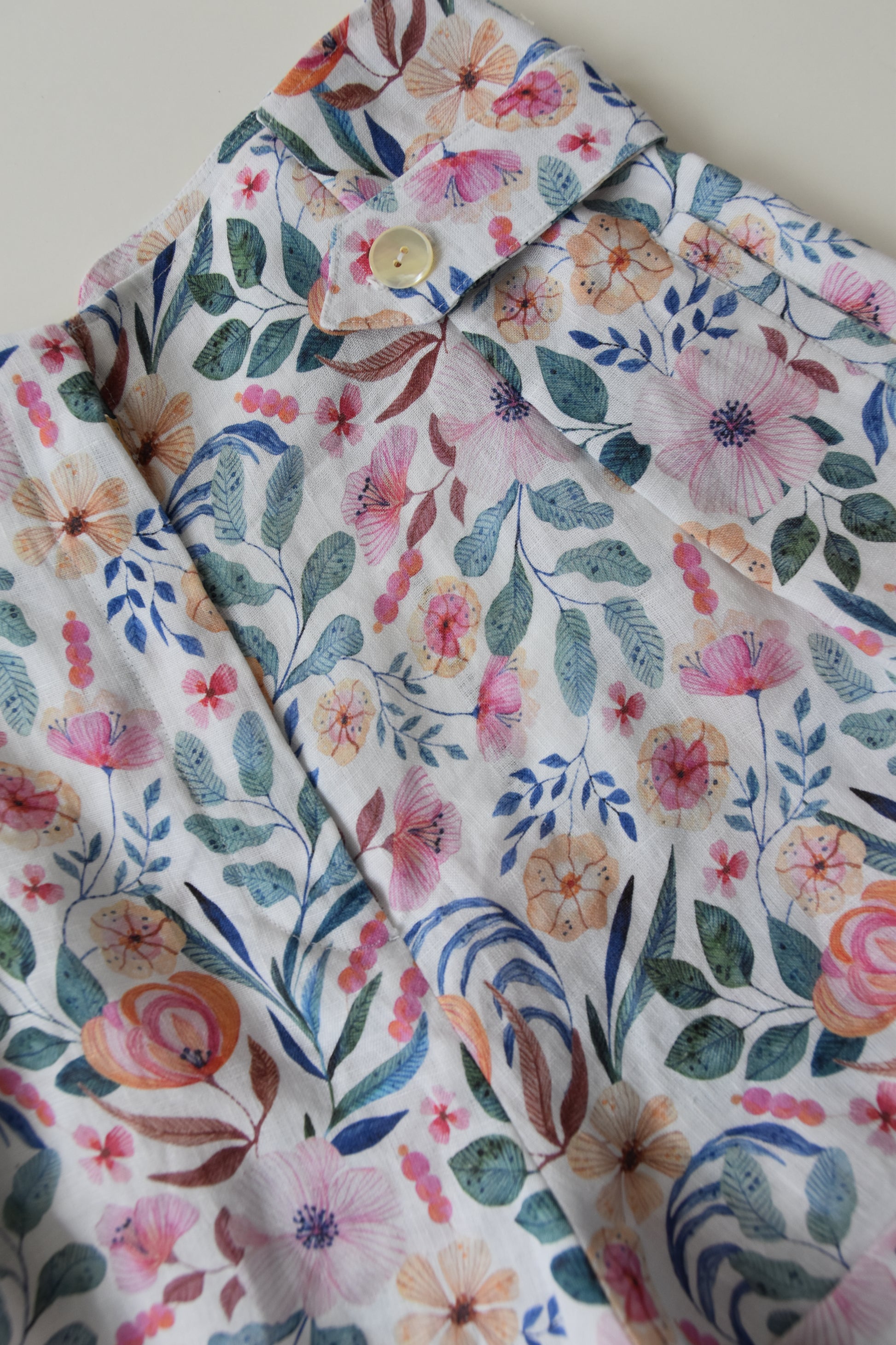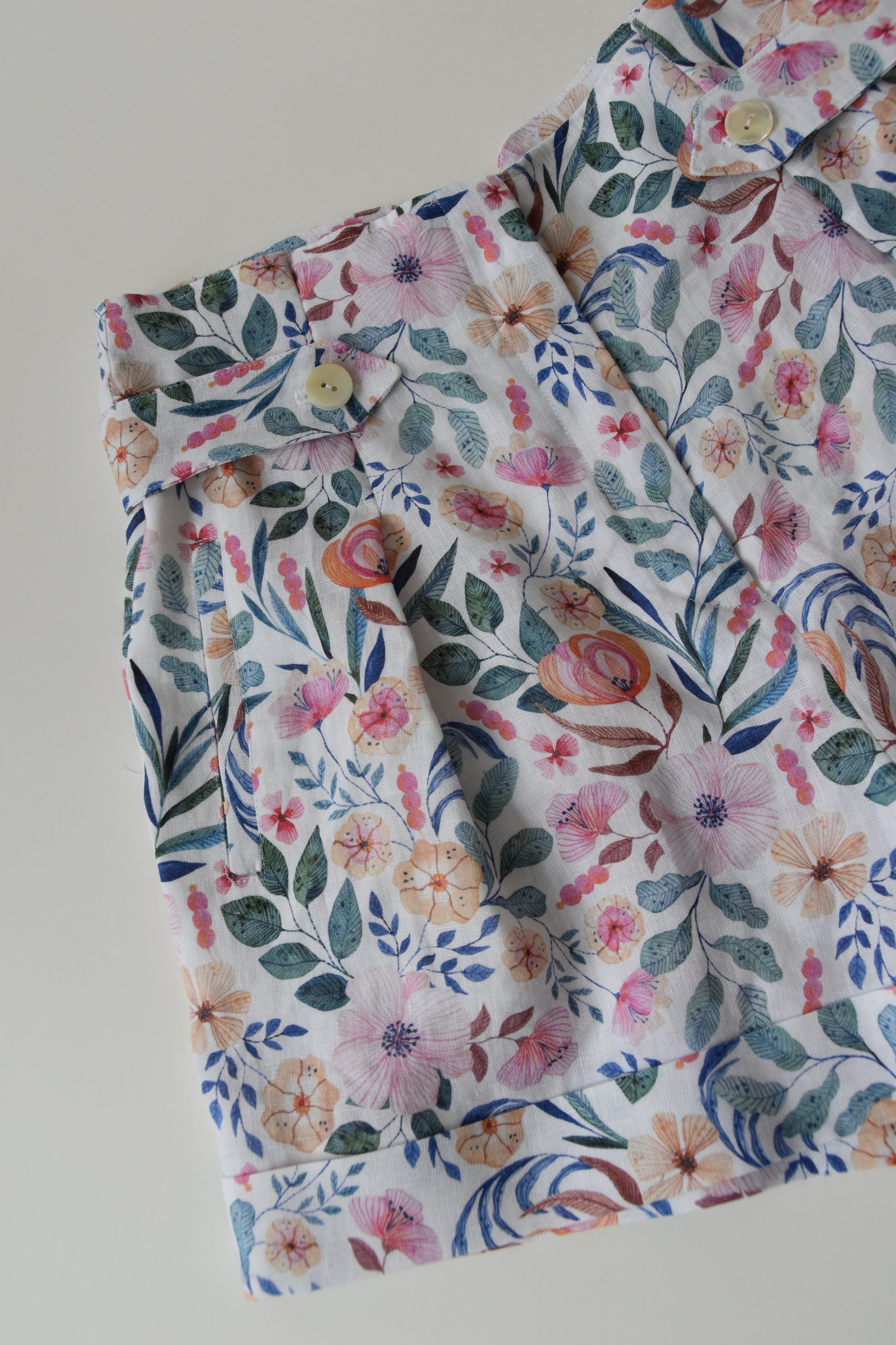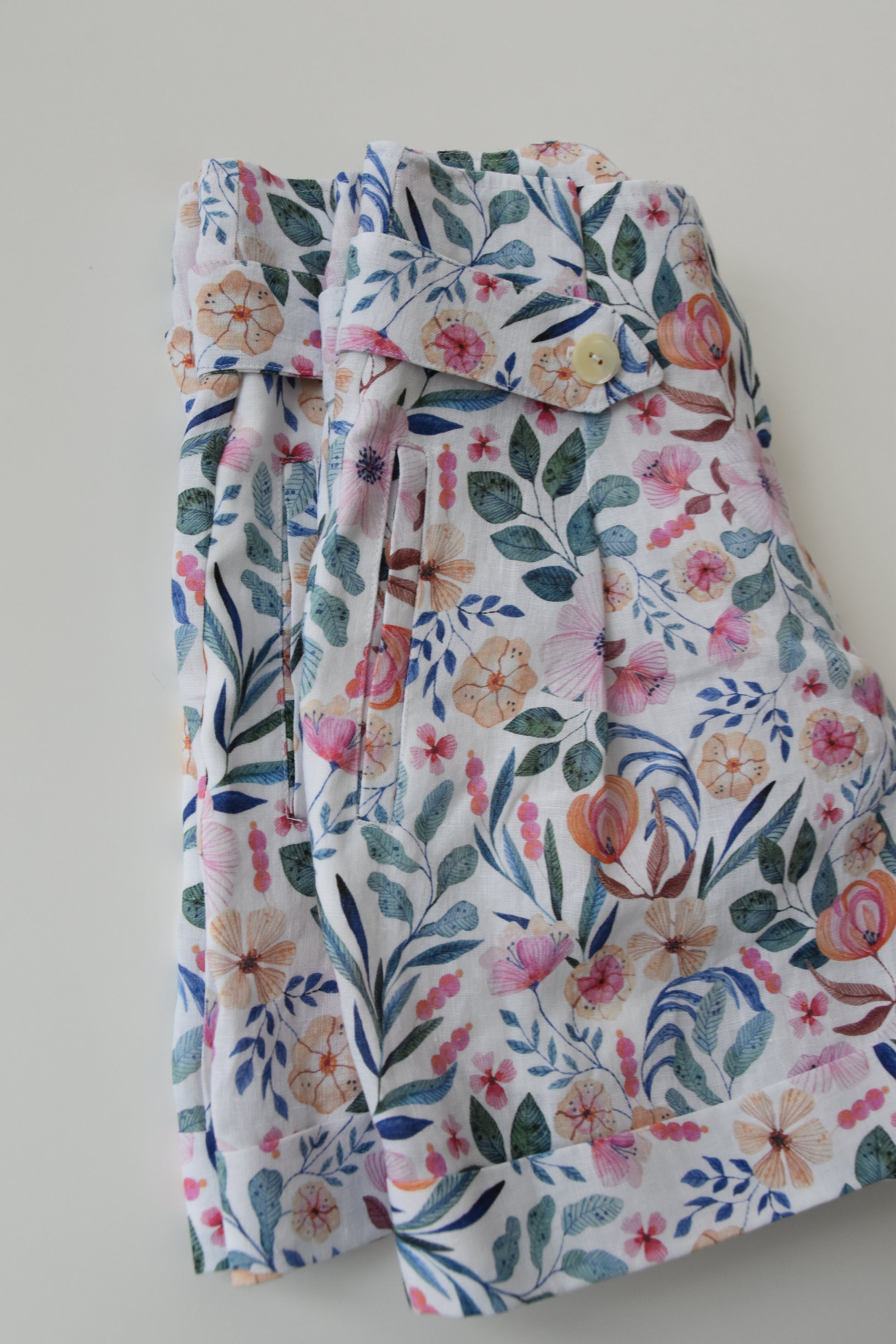 Die Leinen Shorts Spring verbinden sommerliche Leichtigkeit mit einem detailverliebten Design. Der farbenfrohe, florale Print auf hochwertigem Leinen macht jedes Exemplar zu einem Blickfang.